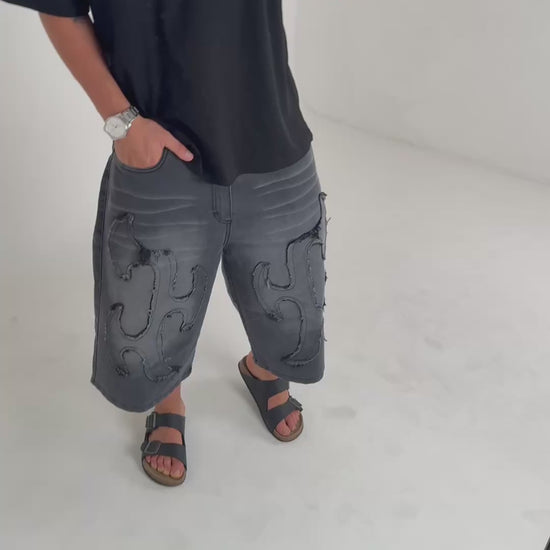 La bermuda super baggy negra es una prenda urbana y llamativa, diseñada para quienes buscan un look relajado con presencia. Su calce extra amplio aporta comodidad y un estilo street definido, mientras que el diseño bordado en el frente, con forma de estrella abstracta, suma un detalle distintivo que destaca sin exagerar. Es ideal para outfits modernos, únicos y con mucha actitud.